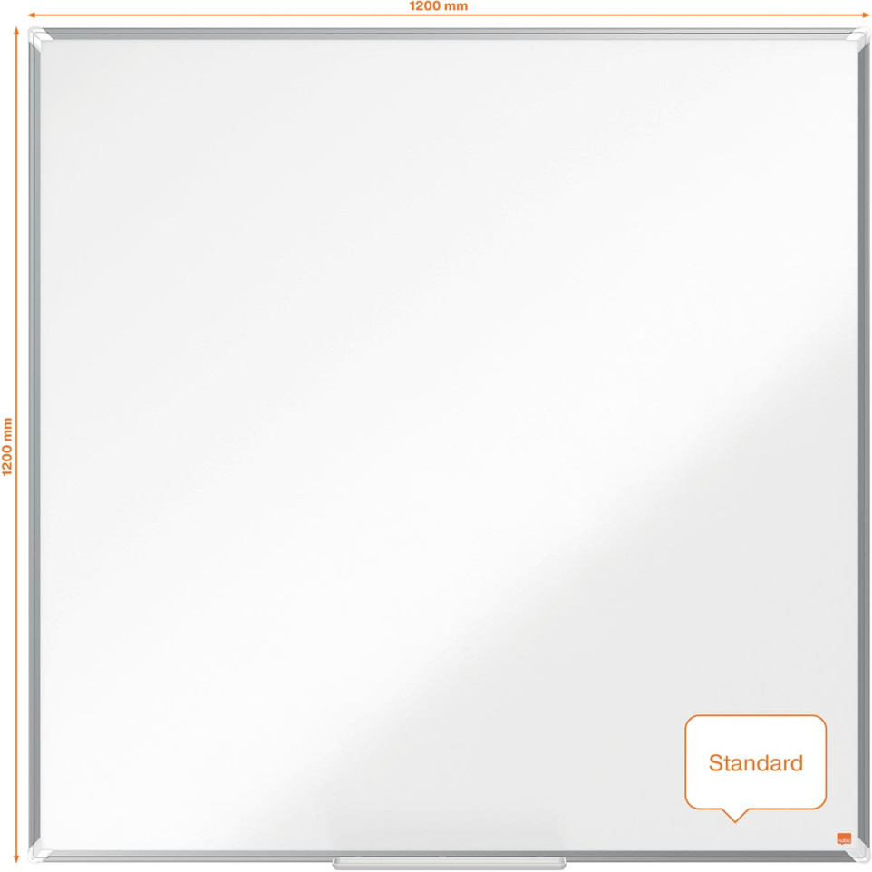 Tableau blanc magnétique Nobo Premium Plus de 120 x 120 cm, idéal pour les espaces collaboratifs, salles de réunion ou établissements scolaires. Il permet d’écrire, d’effacer et d’accrocher des documents à l’aide d’aimants pour un usage polyvalent.