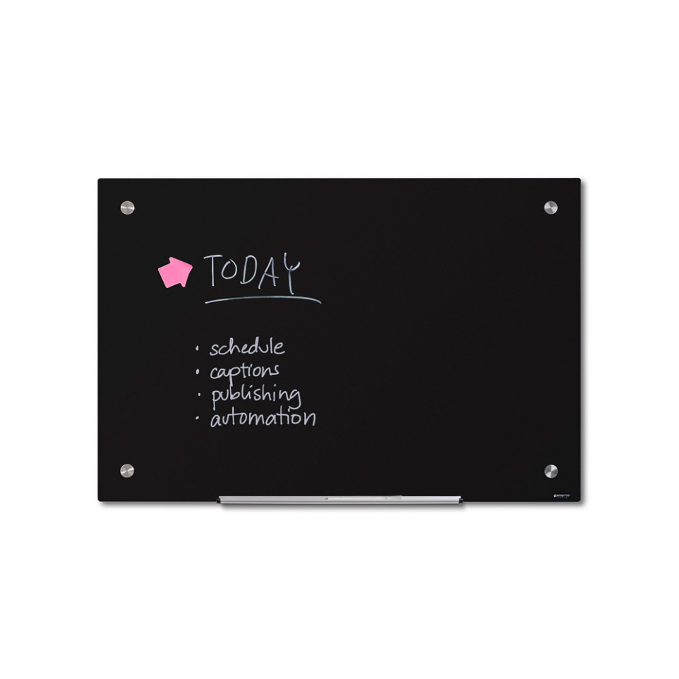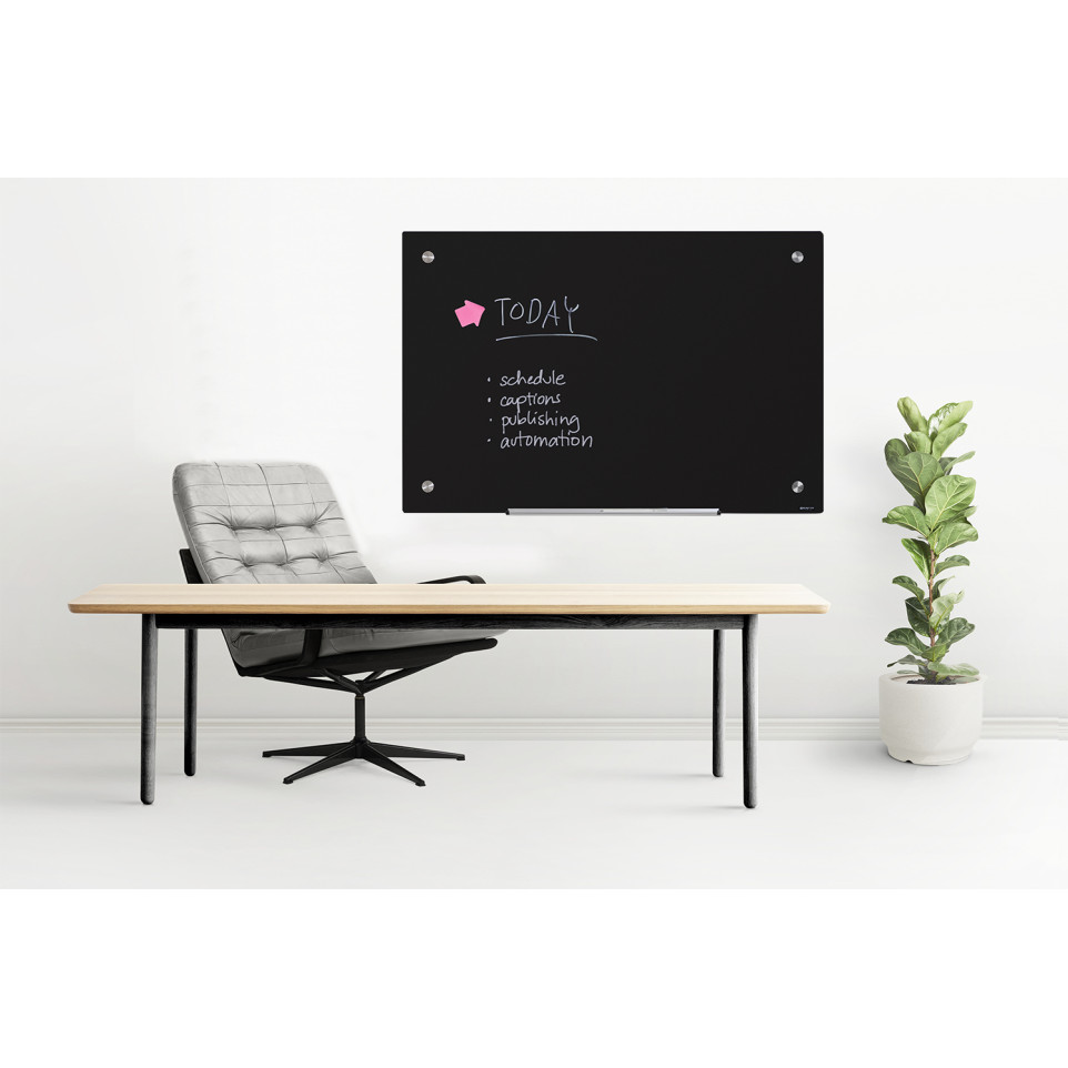 Le Scritto® Glassboard Black est un tableau en verre noir de 90 x 60 cm, conçu pour l'affichage et l'écriture dans des environnements professionnels ou commerciaux, en orientation portrait ou paysage.