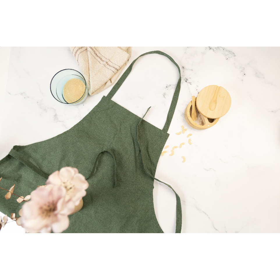Tablier de cuisine fabriqué à partir de 70% de coton recyclé et 30% de polyester RPET, grammage 180 g/m², idéal pour préserver ses vêtements lors de la préparation des repas à domicile ou en environnement professionnel.