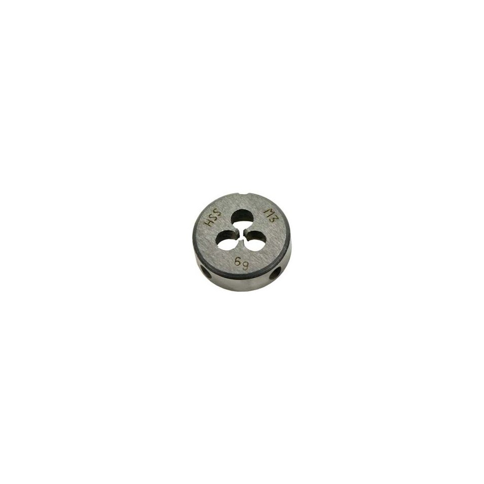 Filière ronde extérieure M3 destinée à la création ou la réparation de filetages extérieurs métriques de 3 mm de diamètre, adaptée aux travaux de mécanique, d’entretien et de bricolage spécialisés.