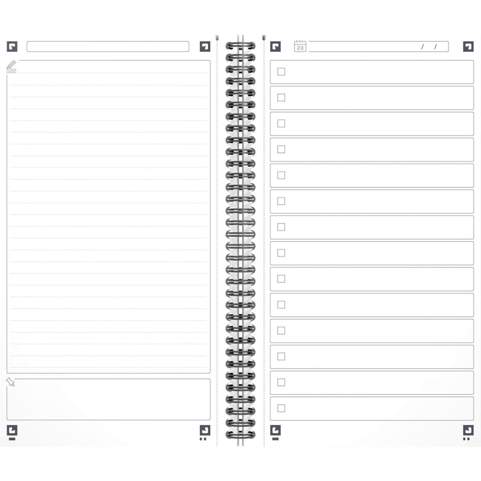Il suffit d’inscrire vos tâches sur chaque page et d’utiliser le système de cases à cocher pour suivre leur avancement. Une diagonale signale une tâche commencée, un carré autour de la case attire l’attention sur l’urgence, et une seconde diagonale valide l’achèvement. Le module “quotidien” facilite le suivi journalier de vos activités.