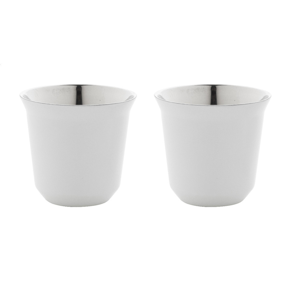 Set de 2 tasses à espresso de 80 ml, en acier inoxydable recyclé, dotées d’une double paroi isolante. Leur forme capsule assure une prise en main ergonomique. Présentées dans une boîte en papier kraft, idéales pour le bureau ou la maison.