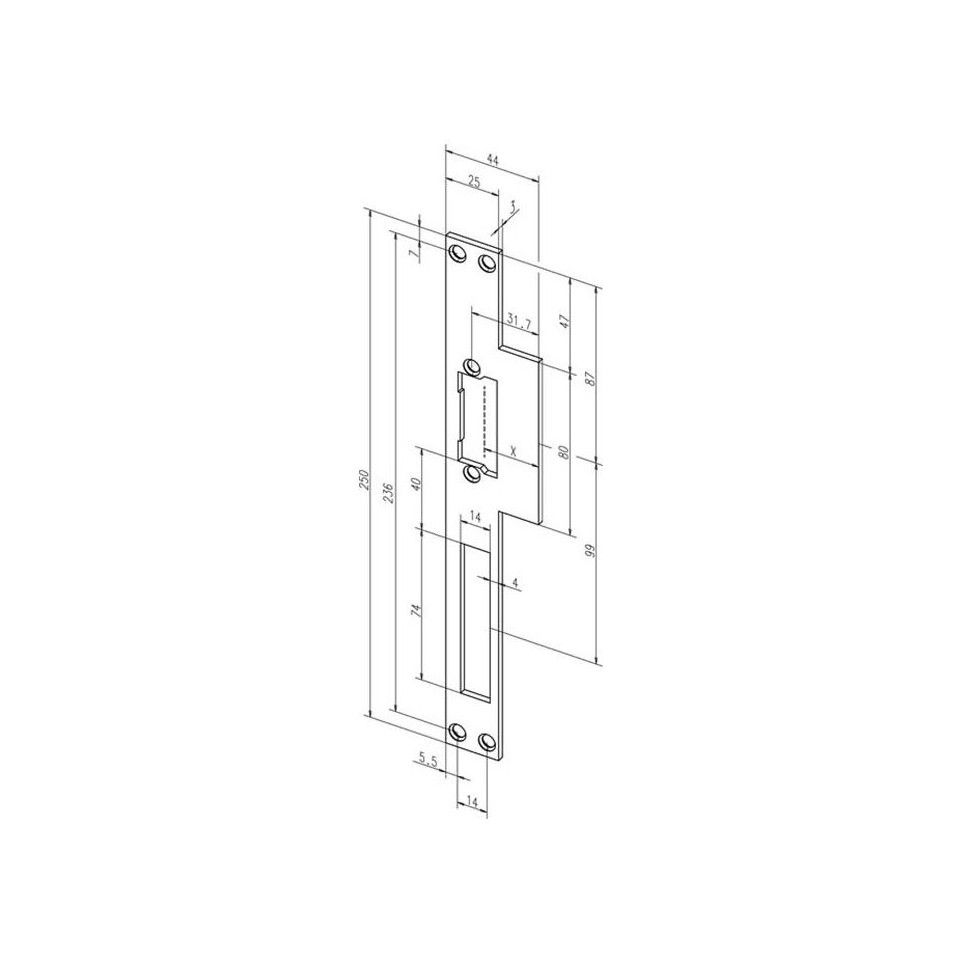 - Longueur : 250 mm, largeur : 44 mm, épaisseur : 3 mm, dimension X : 23,4 à 26,4 mm.