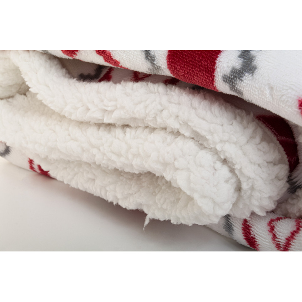 Couverture de Noël réversible, confectionnée en RPET double épaisseur : une face polaire flanelle 230 g/m² et une doublure sherpa 210 g/m², idéale pour des moments de convivialité à la maison pendant les fêtes.