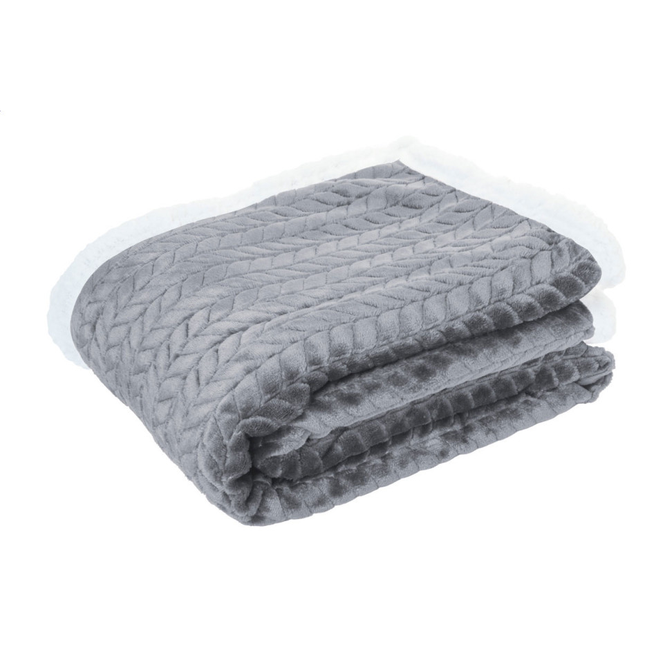 Couverture d’intérieur grise en RPET, double épaisseur, réversible, idéale pour créer une ambiance chaleureuse sur un canapé, un lit ou lors de moments cocooning à la maison ou au bureau.