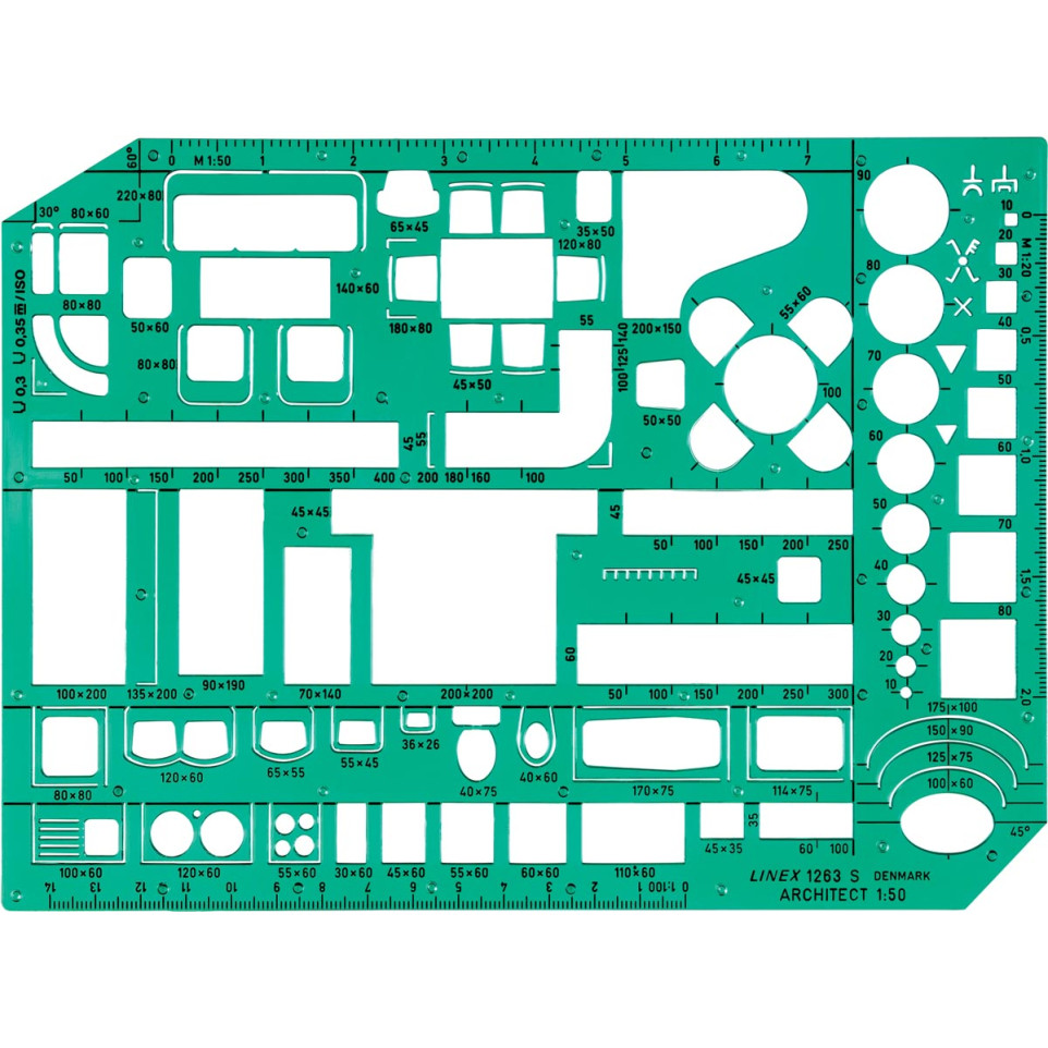 Trace ameublement Linex en plastique transparent vert, conçu pour la réalisation précise de plans d’intérieur. Convient aux architectes, décorateurs et étudiants en design d’espace, utilisable avec crayon ou feutre.