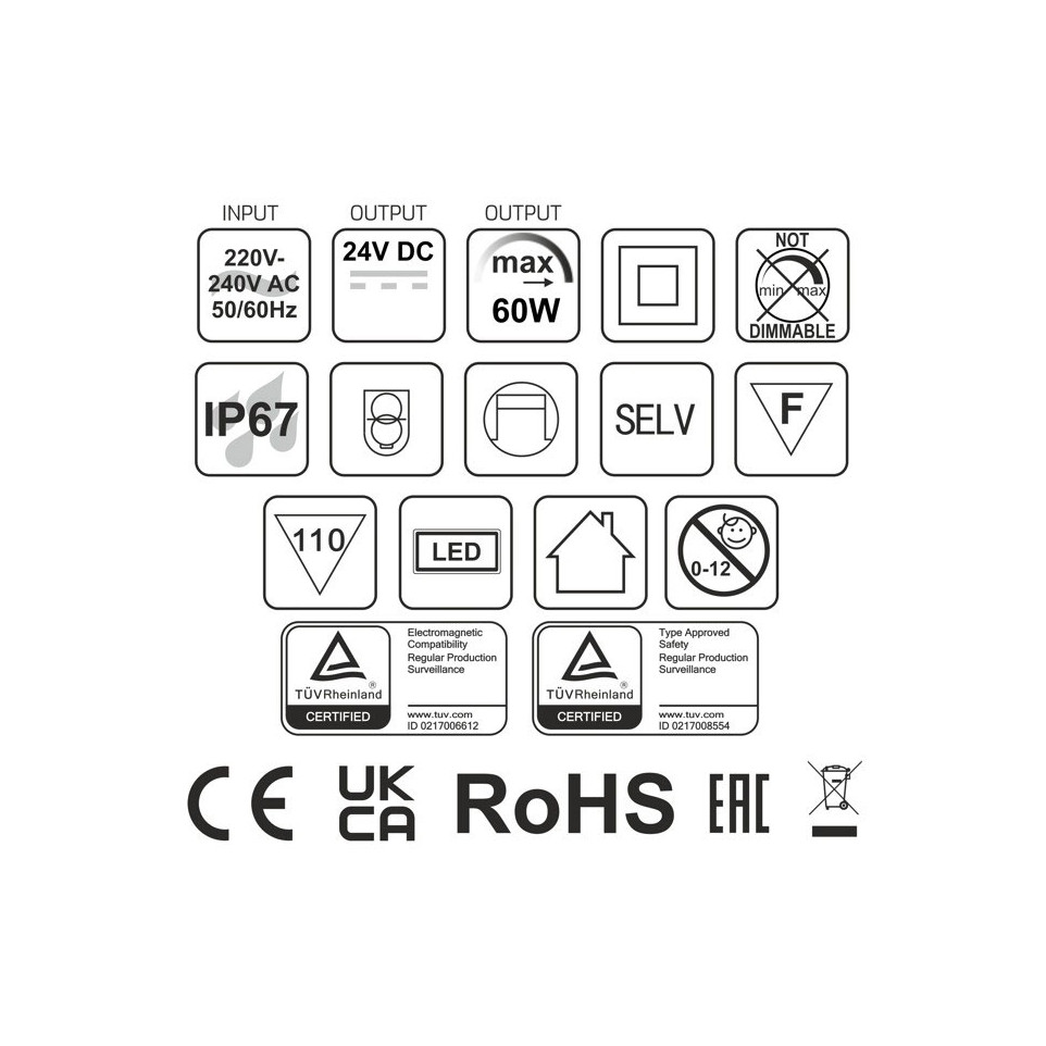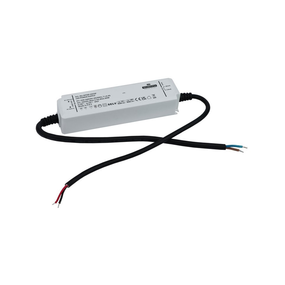 Raccordez le câble d'entrée au réseau secteur 220-230 VAC et le câble de sortie à votre installation LED 24V DC. Grâce à son indice IP67, ce driver peut être installé en extérieur ou dans des environnements humides. Veillez à ne pas dépasser la puissance maximale de 60W et à assurer une ventilation suffisante pour respecter la limite de température de fonctionnement.