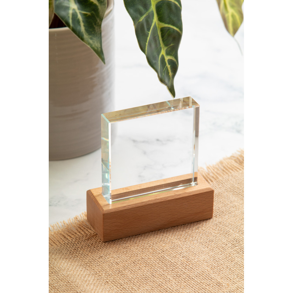 Un trophée élégant en verre transparent avec socle en bois de hêtre. Parfait pour récompenser l'excellence, célébrer les réussites ou commémorer des événements spéciaux. Livré dans une boîte cadeau kraft.