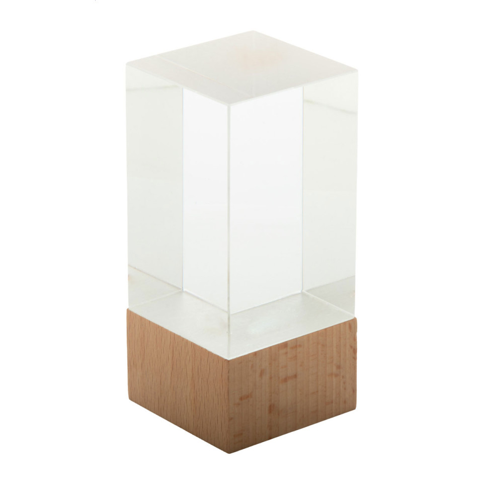 Trophée en verre naturel et transparent, monté sur un socle en bois de hêtre. Idéal pour récompenser un accomplissement lors de cérémonies, d’événements professionnels ou de compétitions.