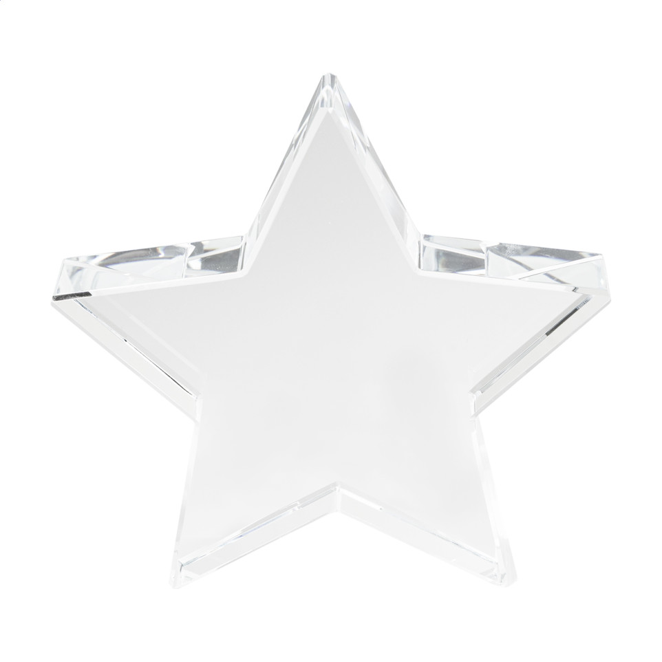 Trophée en verre transparent en forme d'étoile, présenté dans un coffret cadeau noir élégant. Idéal pour récompenser des performances, célébrer des succès ou marquer des occasions spéciales en entreprise.