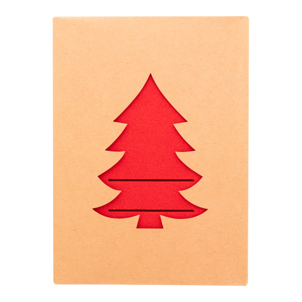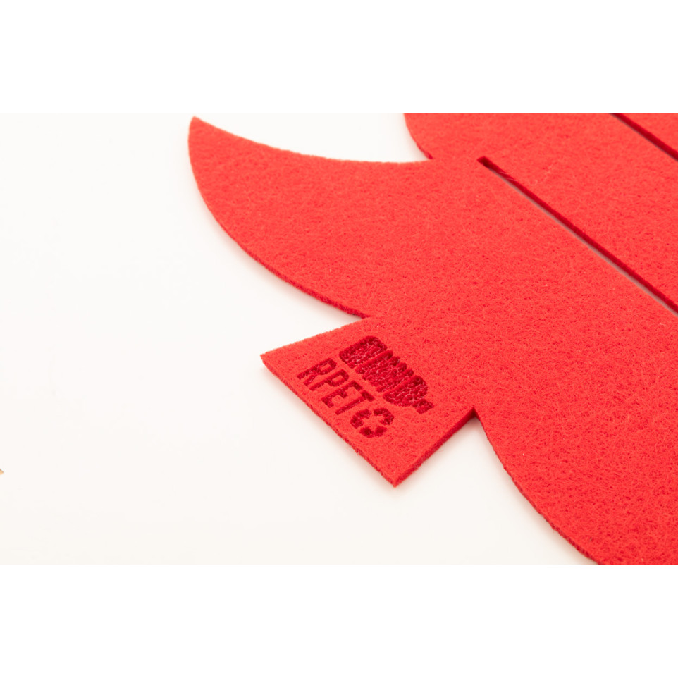 Set de 4 porte-couverts en feutre RPET rouge, en forme d’arbre de Noël. Idéal pour la décoration festive des tables lors de repas de fin d’année en famille ou en entreprise. Livré dans une boîte en papier kraft.
