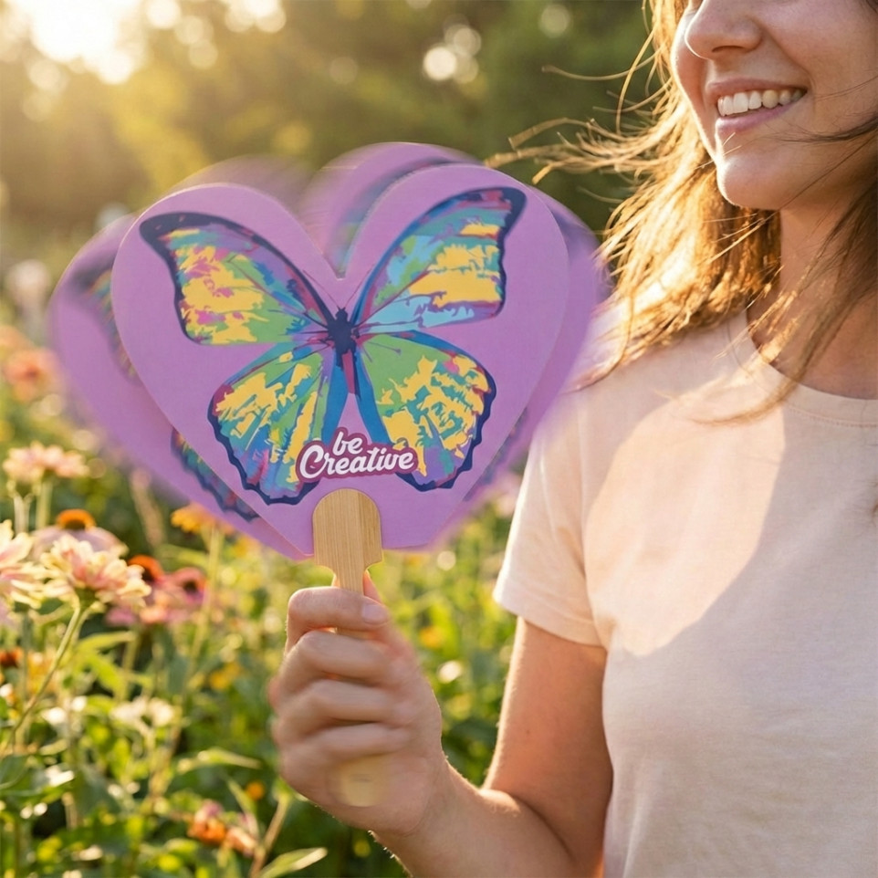 Éventail léger et pratique, idéal pour les événements estivaux, les salons ou les campagnes promotionnelles en plein air. Conçu avec un manche en bambou et un papier laminé résistant.