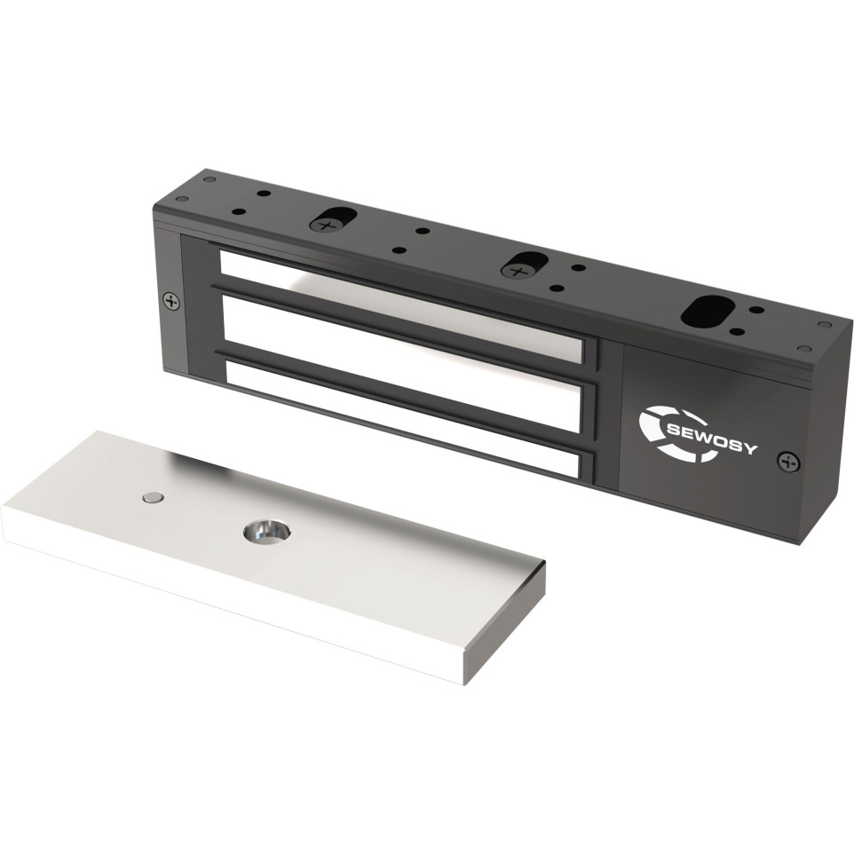 Ventouse électromagnétique apparente 550 DaN 12/24V avec finition noire et signalisation, destinée aux systèmes de verrouillage pour portes en rénovation ou dans des environnements nécessitant une installation rapide, sans réservation spécifique.
