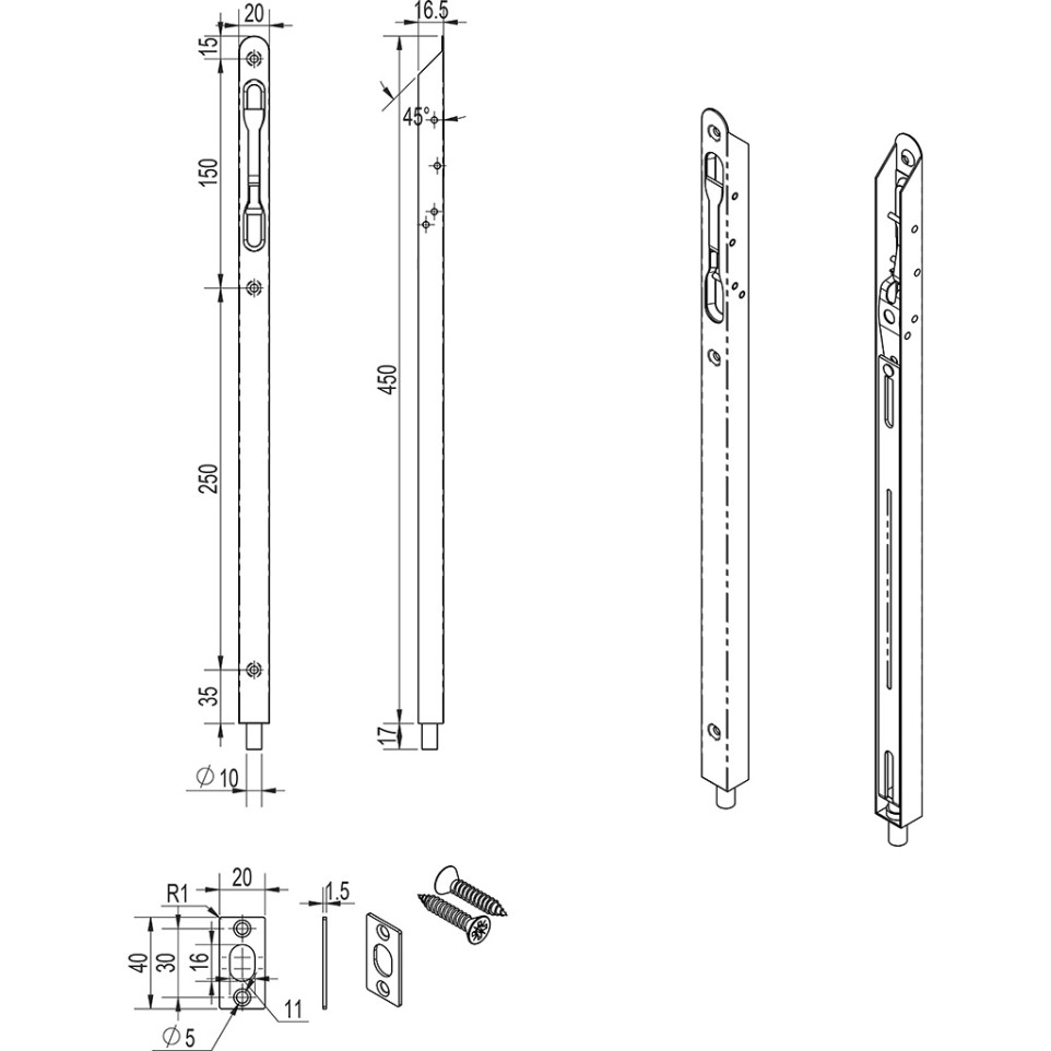 Verrou à bascule encastré standard en acier inoxydable AISI 304, longueur 450 mm, conçu pour l’installation dans les menuiseries bois. Convient à la sécurisation de portes et volets nécessitant une fixation fiable et discrète.