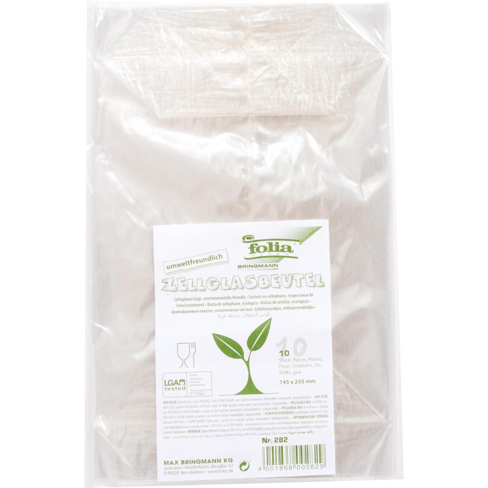 Transparante Folia cellofaanzakjes in een pak van 10 stuks, formaat 145 x 235 mm. Geschikt voor het netjes verpakken van geschenken, kaarten, snoepjes of kleine producten. Handig voor particulieren, winkels en creatieve toepassingen.