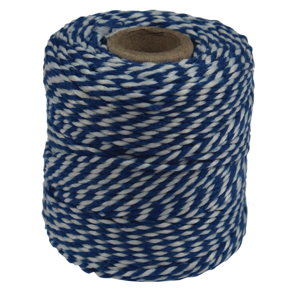 Blauw-wit gedraaid katoentouw van 50 g op klos, met een lengte van ongeveer 55 meter. Geschikt voor het inpakken, knutselen of bundelen van lichte materialen.