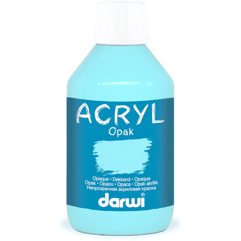 DARWI 250 ml fles Acrylverf opaak, blauw Acrylverf biedt talloze creatieve mogelijkheden voor amateurkunstenaars, professionals en hobbyisten. Acrylverf is een verf op waterbasis en is niet giftig. Ze is gemakkelijk te gebruiken en daardoor ideaal voor een breed publiek. Acrylverf is geschikt voor vele toepassingen, ze hecht op diverse ondergronden: zelfhardende klei, gips, papier, karton, hout, glas, aluminium, enzovoort. Deze onuitwisbare verf droogt ook snel, waardoor het mogelijk is om meerdere lagen kleur op elkaar aan te brengen voor het bekomen van unieke effecten en texturen. Ze kan worden aangebracht met een penseel, spons, of direct uit de tube met behulp van de applicator, waardoor er relief aan de creaties wordt toegevoegd. Deze afwerking is rijk aan pigmenten en dekt het oppervlak volledig zonder de basiskleur door te laten schijnen. Het assortiment omvat 38 mengbare, matte, sterk dekkende kleuren met een hoge viscositeit.