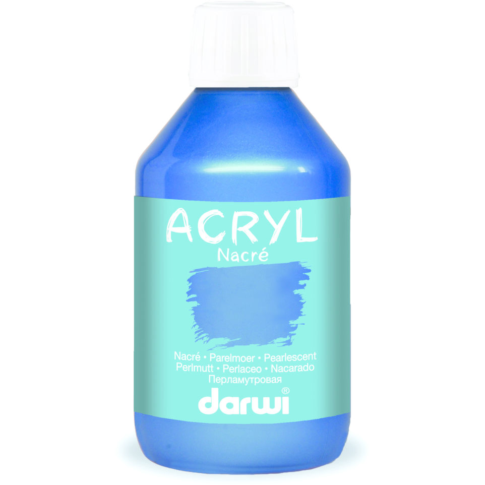 DARWI Fles 250ml acrylverf parelmoer blauw Acrylverf biedt een schat aan creatieve mogelijkheden voor professionele kunstenaars en hobbyisten. Acrylverf is een verf op waterbasis, gemakkelijk te gebruiken en niet giftig, waardoor ze geschikt is voor het grote publiek. Ze hecht op vele ondergronden: zelfhardende klei, gips, papier, karton, hout, glas, aluminium, enz. Acrylverf is onuitwisbaar en droogt snel, waardoor verschillende lagen kleur over elkaar heen kunnen worden aangebracht voor het verkrijgen van unieke effecten en texturen. Ze kan worden aangebracht met een penseel of spons, of rechtstreeks uit de tube dankzij de precisietip om reliëf toe te voegen aan je creaties. De parelmoerkleuren zorgen voor een zachte iriserende glans die doet denken aan de glinstering van parels. Het assortiment bestaat uit 8 mengbare en dekkende kleuren met een gemiddelde viscositeit.