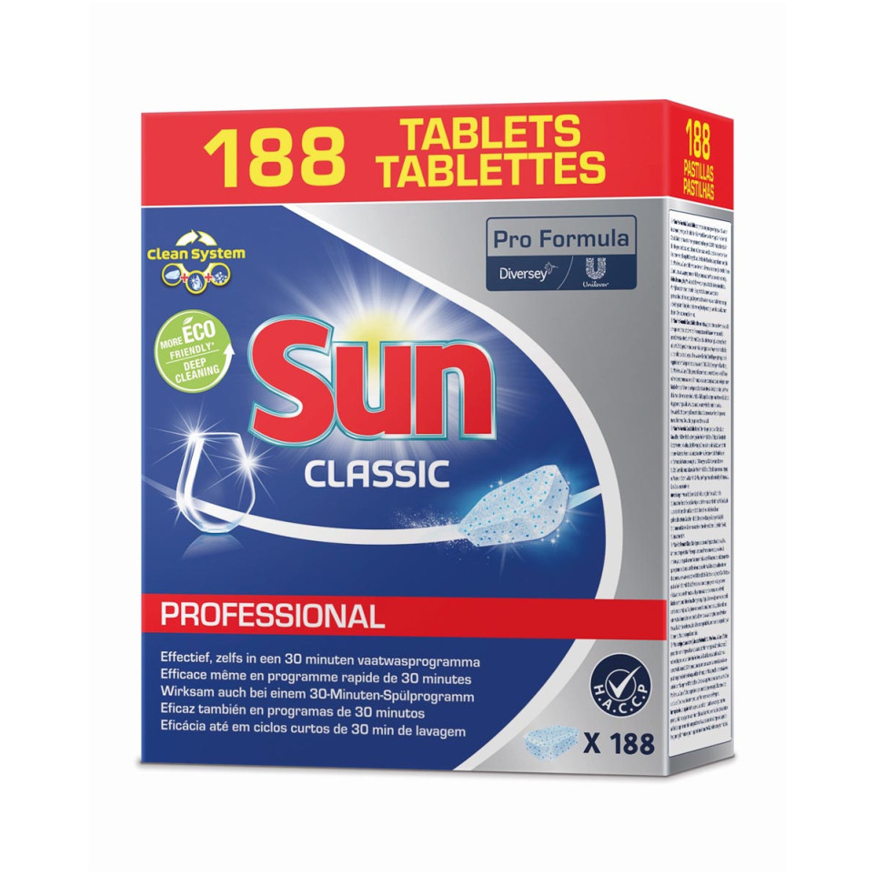 Sun Classic vaatwastabletten zorgen voor uitstekende vuilverwijdering in iedere vaatwasmachine en zijn geschikt voor 188 automatische reinigingsbeurten. Speciaal ontworpen om hardnekkige vlekken zoals koffie, thee en lippenstift te verwijderen. De tabletten zijn makkelijk te doseren en leveren optimale resultaten in alle waterhardheden. Ideaal voor zowel thuisgebruik als professioneel gebruik.
