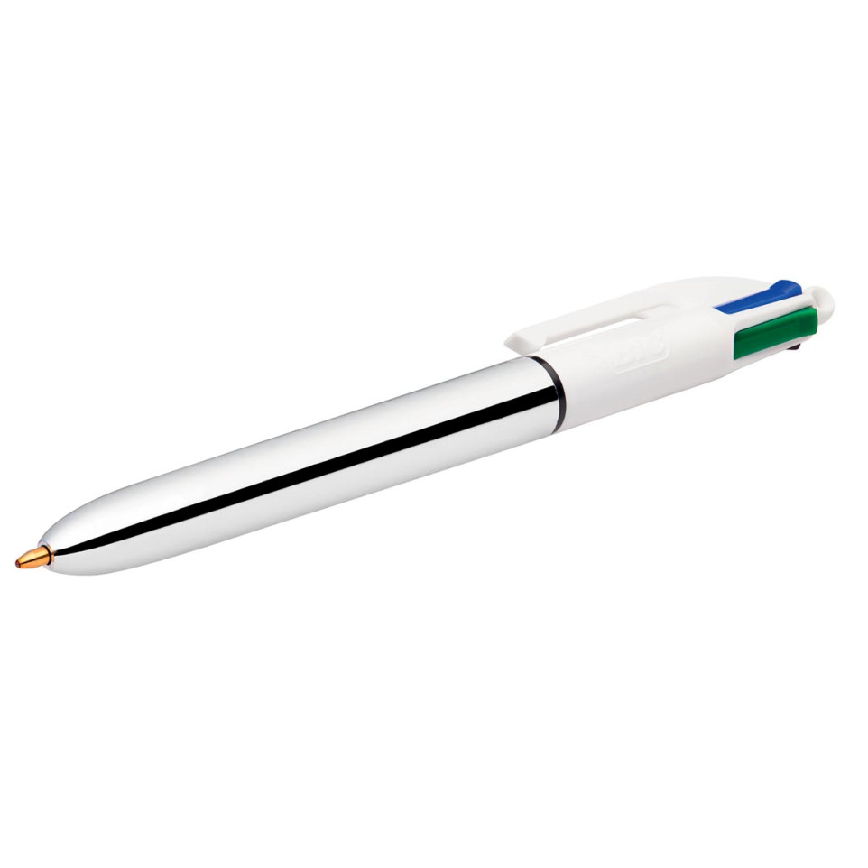 De Bic Colours Shine 4-kleurenbalpen combineert vier klassieke inktkleuren (rood, groen, blauw, zwart) in één intrekbare, navulbare pen met zilverkleurig lichaam. Ideaal voor werk, studie en dagelijks gebruik.