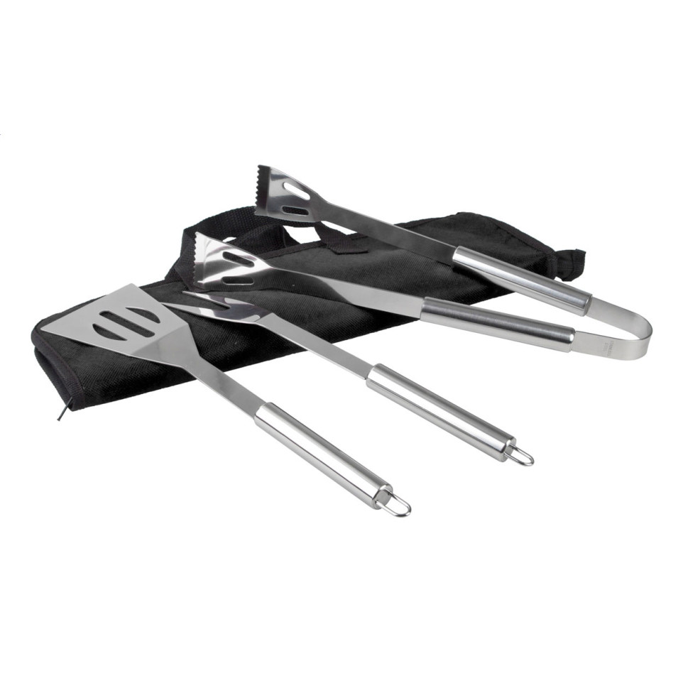 Drie delige RVS barbecue set bestaande uit een vork, spatel en tang, verpakt in een stevige nylon draagtas met ritssluiting. Compact en ideaal voor buitengebruik tijdens barbecues, tuinfeesten of op de camping.