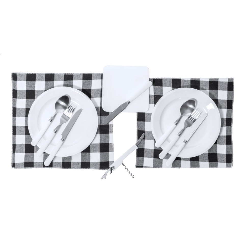 De set is gemaakt van stevig 600D gerecycled PET polyester, inclusief kunststof tafelgerei en bestek.