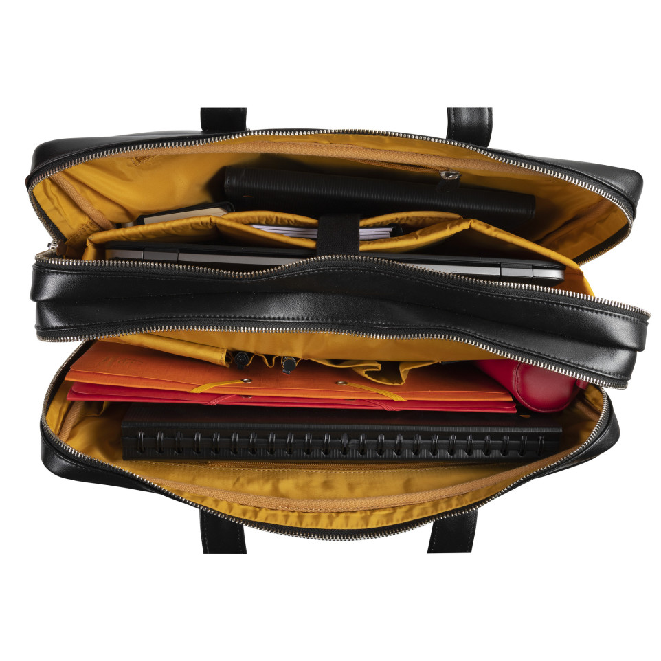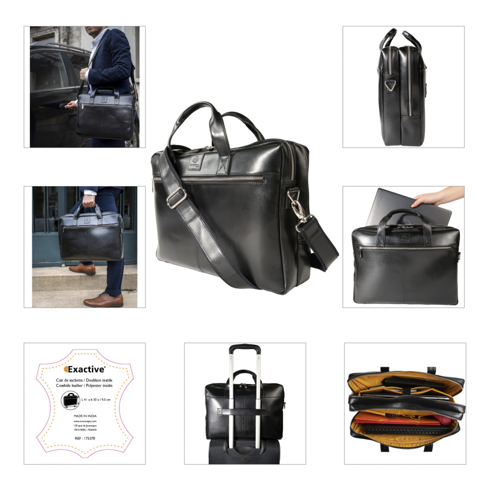 Computertas Exactive Leder - met dubbel compartiment In navolging van de sobere en elegante stijl van het Exactive-gamma, zal de lederen bagage de professionals die op zoek zijn naar kwaliteit en chic voor de beste prijs verleiden. De Exactive computertas met dubbel compartiment is van rundleder gemaakt, een hoogwaardig materiaal, bestendig tegen water en slijtage. De tas met twee vakken heeft veel compartimenten voor het vervoeren van laptop, tablet, mappen, notebooks, computeraccessoires .... Binnenin is het computervak versterkt voor optimale bescherming. Daarnaast een versterkte tas om een tablet te dragen, even als een ritstas voor verschillende accessoires. Het opbergvak heeft 2 zones voor het opbergen, een groot ritsvak en verschillende vakjes voor pennen, kaarten, smartphone en smartph one-accessoires. Aan de buitenkant heeft de tas een groot gesloten ritsvak. Een doorgang aan de achterkant om de tas op een telescopische handgreep te plaatsen. Met zijn comfortabel handvat kan de tas met de hand worden gedragen, maar ook op de schouder dankzij de verstelbare afneembare schouderriem.