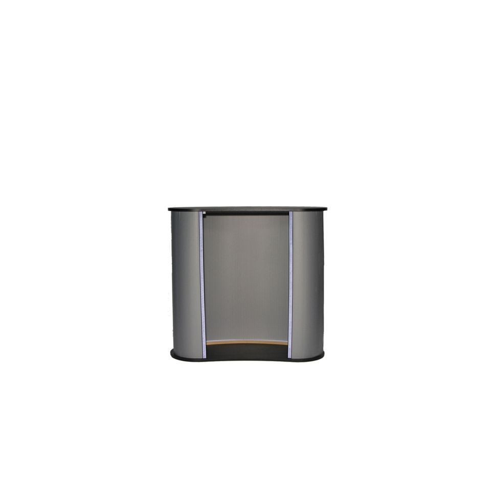 Balie met flexibel grijs hoofdgedeelte en onder- en boventablet van blackkleurig hout.