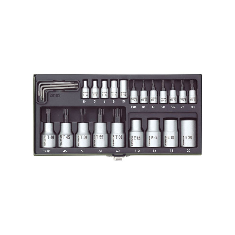 De Proxxon TX speciale bitset met 24 stuks is ideaal voor het los- en vastdraaien van Torx (TX) schroeven en bouten, veelgebruikt in de automotive sector, machinebouw en fijnmechanica.