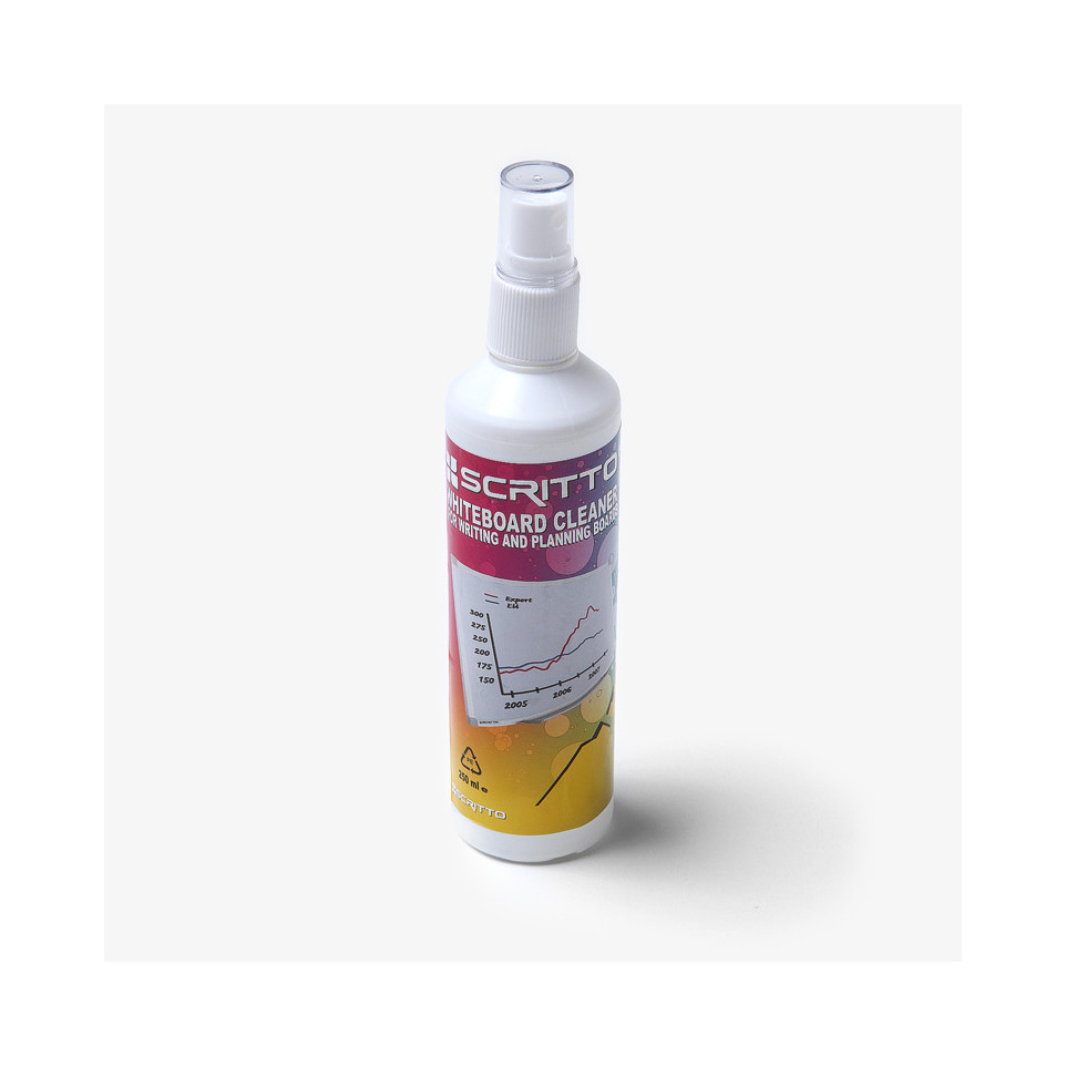 De Scritto® Whiteboard Sprayreiniger verwijdert moeiteloos hardnekkige resten en ghosting van whiteboards, ideaal voor gebruik in kantoren, scholen en thuis.