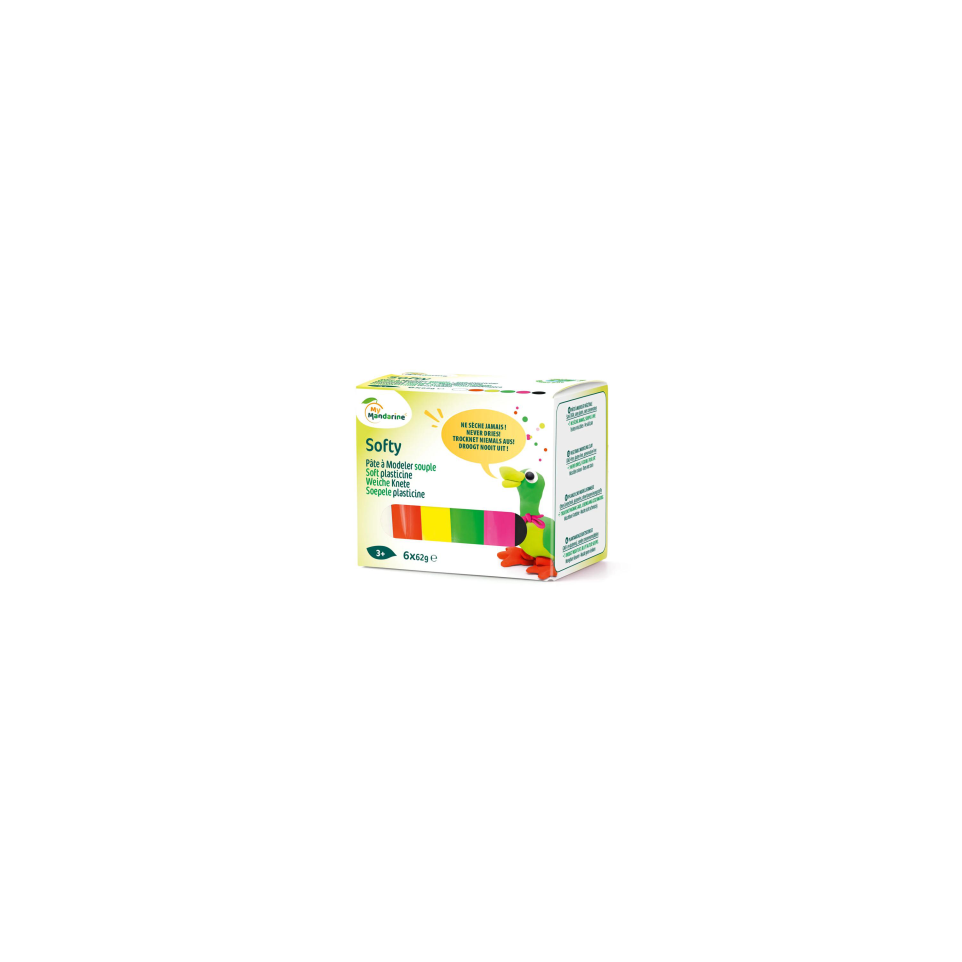 Softy - Assortiment 6 x 62g pâte à modeler enfant souple, pastel, fluo LOT DE 6 PAINS DE 62 G : couleurs fluo à savoir : blanc, orange, jaune, vert, rose et noir. Idéal pour commencer l'initiation de votre enfant à la pâte à modeler. PATE A MODELER SOFTY : c'est une pâte à modeler naturelle, 100% végétale. Elle est sans OGM, sans conservateurs et sans gluten. SOUPLE : la pâte Softy est malléable, y compris par les petites mains. Elle peut donc être utilisée par les enfants à partir de 3 ans. NE SECHE JAMAIS : de par sa composition, elle ne sèche jamais. Elle reste souple à vie et peut donc être utilisée à l'infini ! NE SALIT PAS LES MAINS : ne colle pas au doigts, ni le plan de travail.