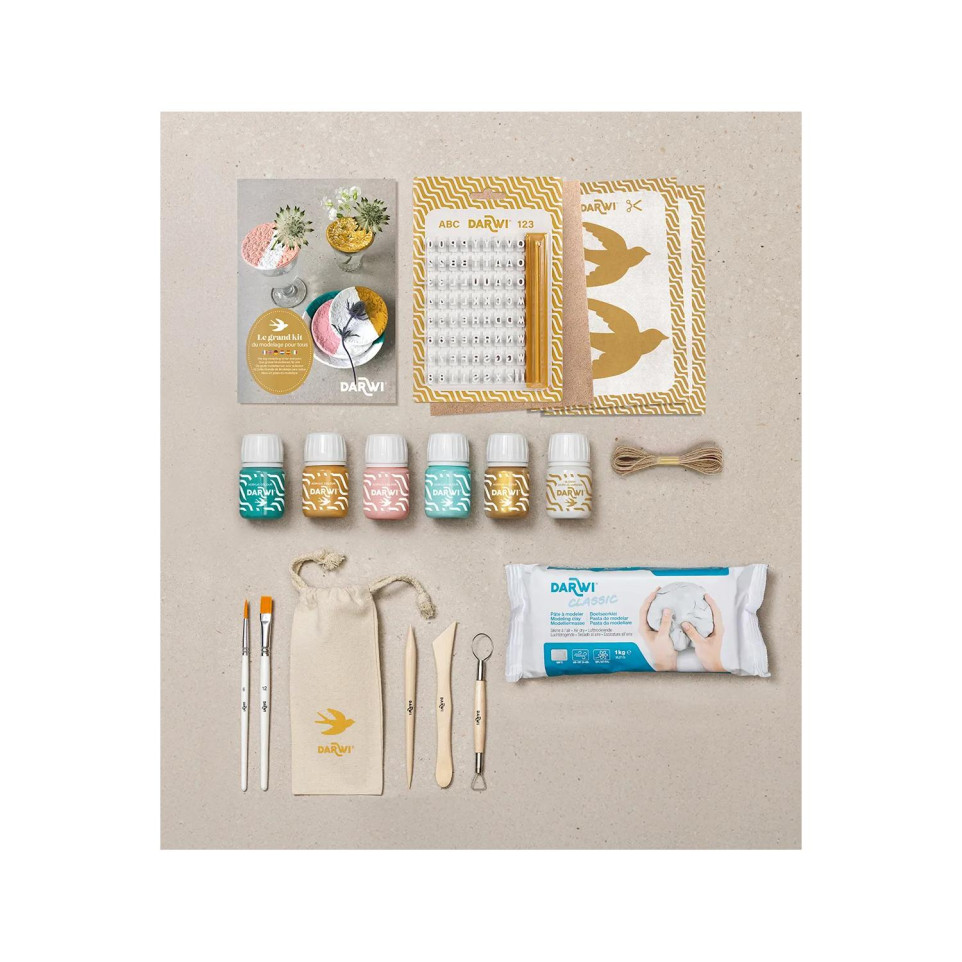 DARWI Het Grote Modelleerkit voor Iedereen (L21,4 x B15,3 x H8,6 cm) Deze kit is speciaal ontwikkeld voor volwassenen, of je nu een beginner bent of een echte boetseerliefhebber. Met deze complete set kun je je creativiteit en ontdekkingsdrang de vrije loop laten, met meer dan 12 inspirerende boetseerprojecten! Dankzij de handige tips en technieken in het creatieve boekje leer je de basis van het boetseren en geef je je ideeën vorm. Inhoud: 1 kg zelfhardende boetseerklei DARWI CLASSIC, 1 meertalig creatief boekje (FR, EN, DE, NL, ES, IT), 3 boetseergereedschappen (priem, modelleerspatel, bandmirette) en 2 penselen in een klein katoenen zakje, 5 flesjes acrylverf: roze (476), oker (746), smar agdgroen (620), muntgroen (640), goud (050), 1 flesje acrylvernis, 1 complete set stempels met letters en cijfers, schuurpapier, snijsjablonen, 5 m natuurtouw.