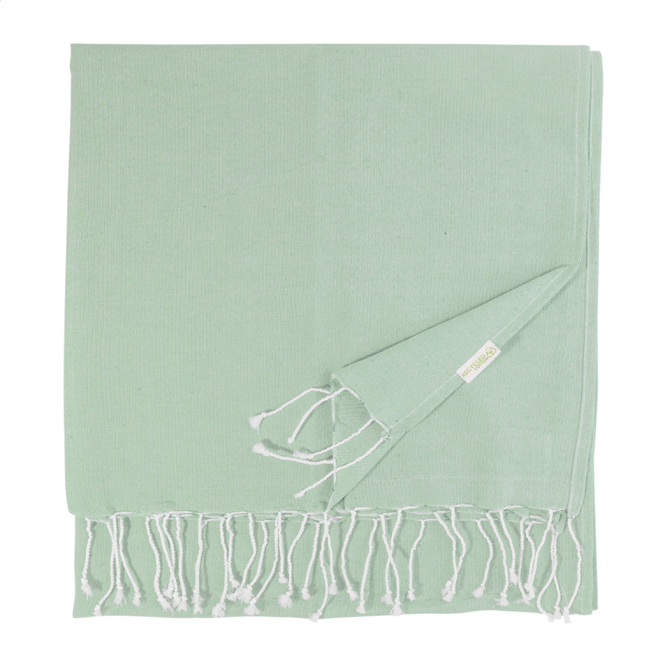 Aruba groen gerecycled katoenen strandlaken, een pareo van 70% gerecycled katoen en 30% RPET polyester met 180 g/m². Ideaal voor strand, zwembad of buitenactiviteiten als veelzijdig accessoire.