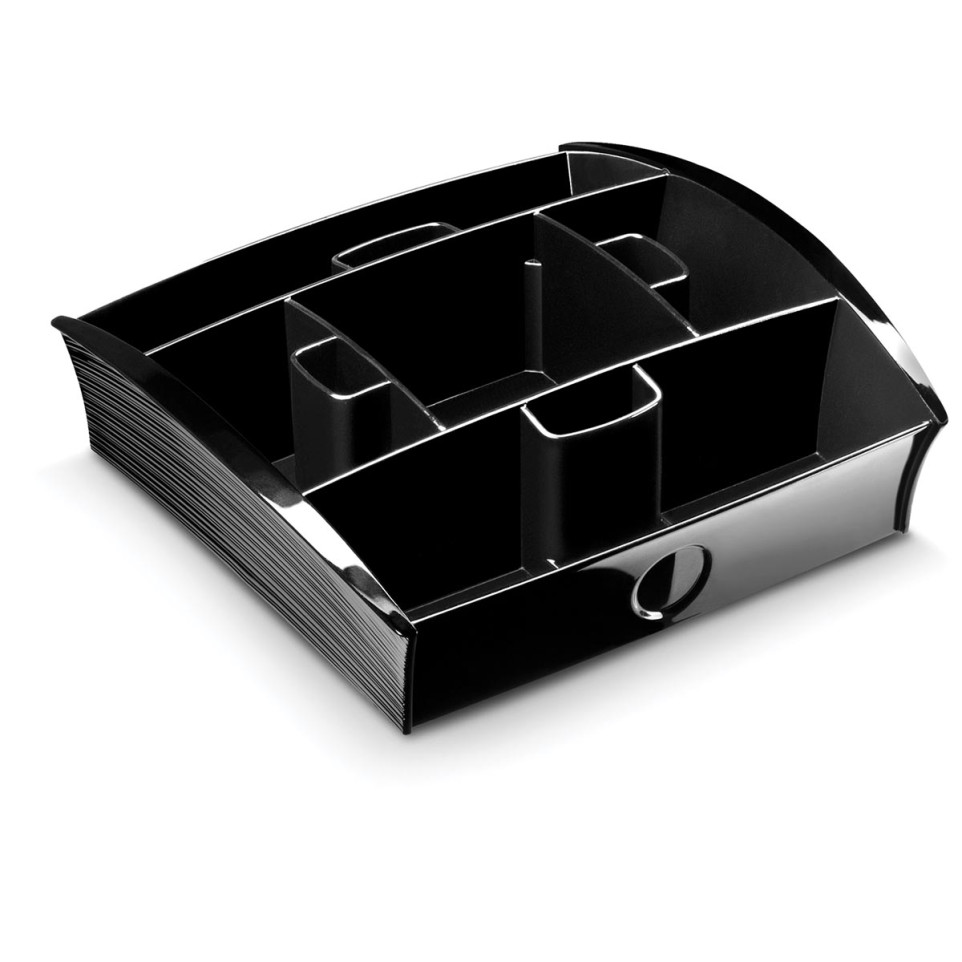 Compact verdeelplateau met meerdere vakjes voor het overzichtelijk opbergen van theezakjes, koffiezakjes, suiker, melk, koekjes en roerstaafjes. Ideaal voor gebruik op kantoor, in vergaderruimtes of bij zelfbedieningspunten.