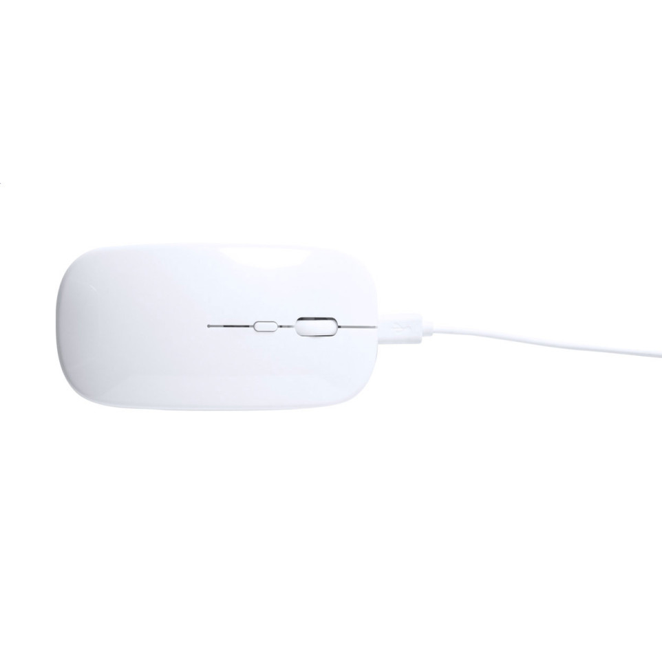 Draadloze optische muis met behuizing van gerecycled ABS-plastic en ingebouwde oplaadbare batterij. Inclusief USB-oplaadkabel voor duurzaam en milieuvriendelijk computergebruik.
