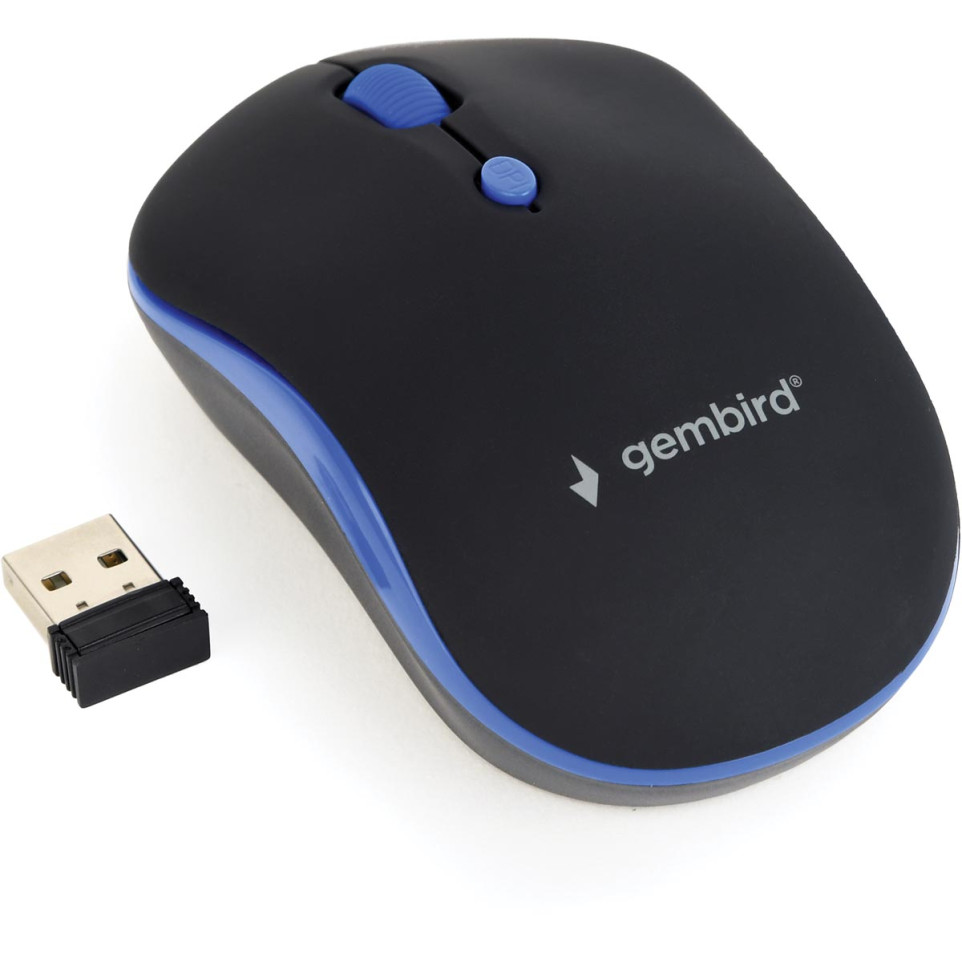 Draadloze optische muis van Gembird met vier knoppen in een blauwe uitvoering, ontworpen voor dagelijks gebruik op kantoor of thuis. Ideaal voor gebruikers die flexibiliteit en precisie belangrijk vinden.