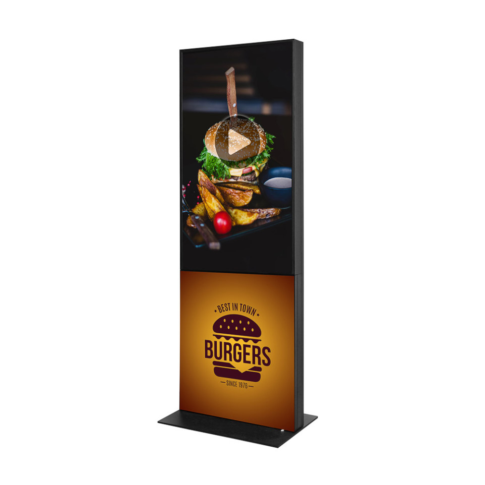 Plaats de totem eenvoudig op een zichtbare locatie, sluit deze aan, en laad uw media via USB of een draadloos netwerk. Het 50" scherm toont dynamisch uw video’s, afbeeldingen of boodschap in hoge kwaliteit en trekt aandacht door het gepersonaliseerde frame met textielprint, dat eenvoudig te verwisselen is.