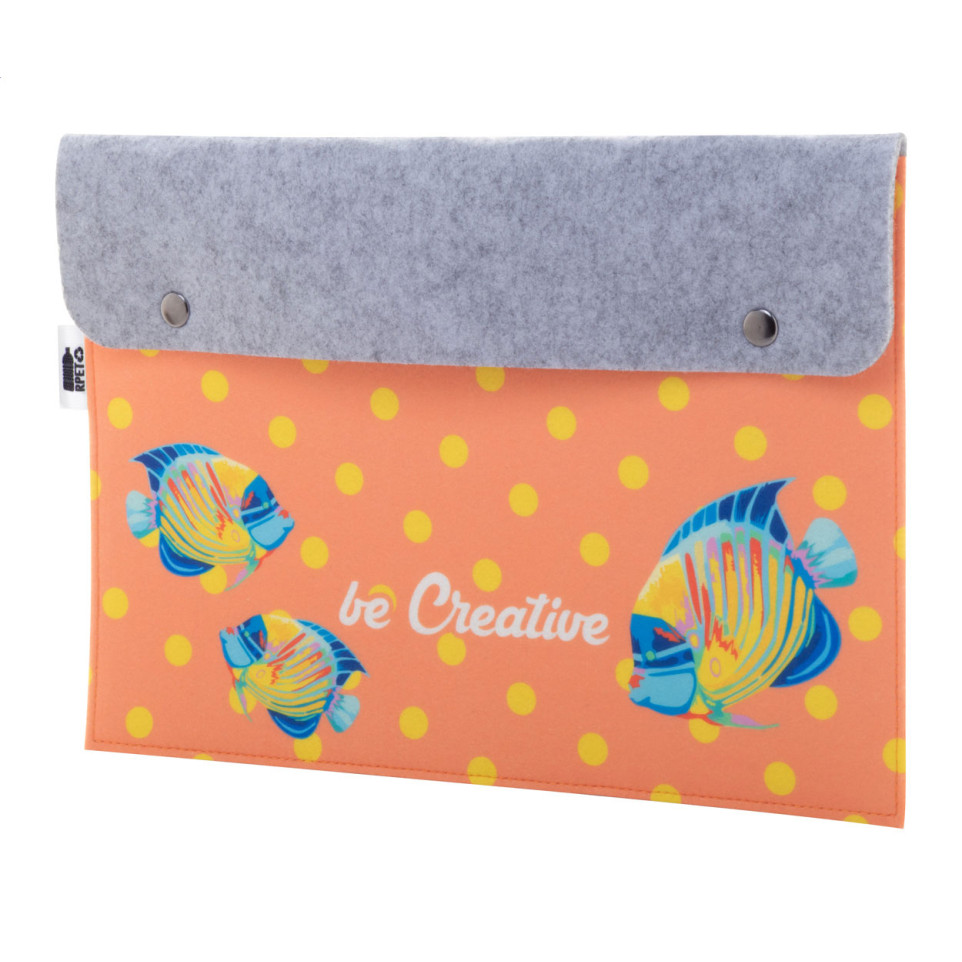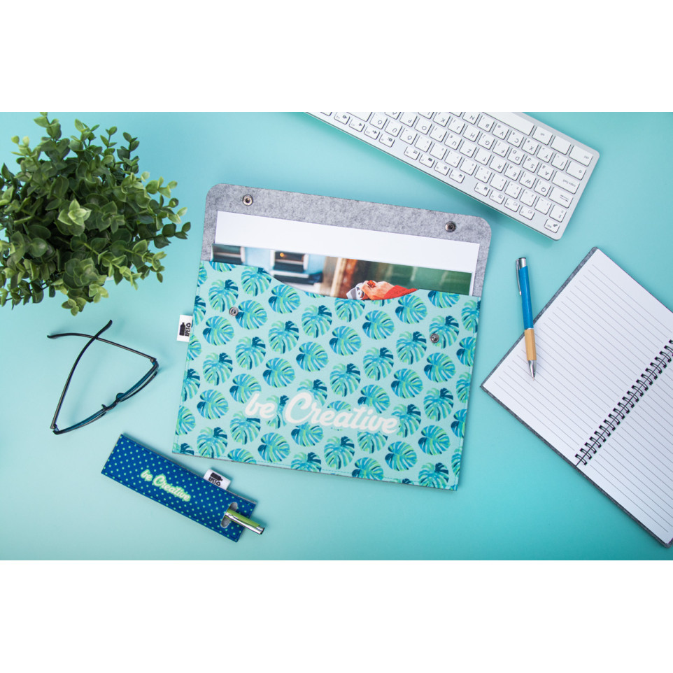- De map is gemaakt van gerecycled RPET-vilt en draagt een RPET-label als bewijs van de duurzame oorsprong.