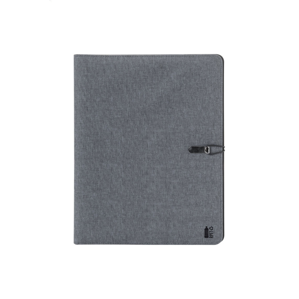 De Shepherd A4 grijze RPET documentmap is een praktische map van stevig 300D gerecycled polyester, uitgerust met een notitieblok van 25 gelinieerde vellen en diverse binnenvakken voor optimale organisatie van documenten en accessoires tijdens vergaderingen, presentaties of onderweg.