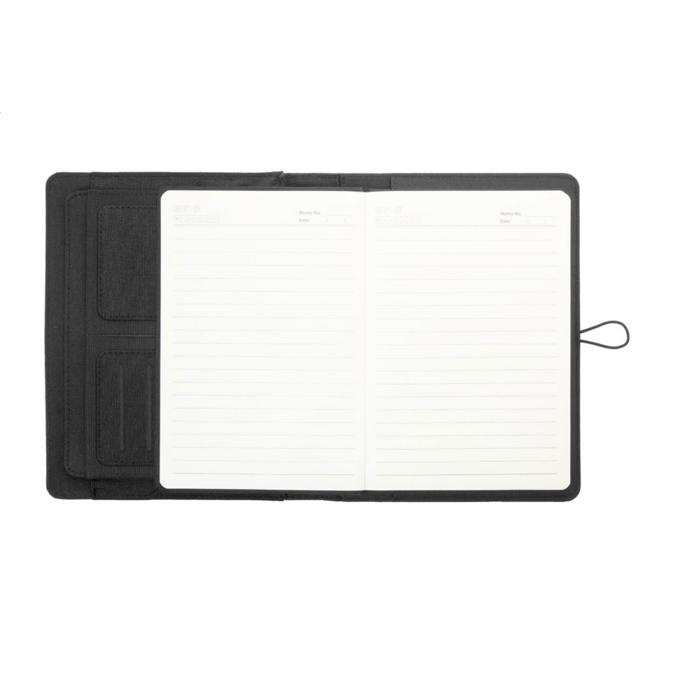 De Shepherd A5 zwarte documentmap is een compacte map van 300D gerecycled PET-polyester, voorzien van 64 gelinieerde vellen in een notitieblok en diverse organiserende binnenvakken. Ideaal voor het overzichtelijk bewaren van documenten en notities onderweg, op kantoor of tijdens vergaderingen.