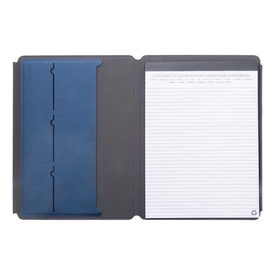 A4-formaat documentmap van blauw gerecycled PU-leer, voorzien van diverse binnenvakken voor optimale organisatie en magnetische sluiting. Inclusief notitieblok met 20 gelinieerde vellen van gerecycled papier, ideaal voor vergaderingen, trainingen of dagelijks gebruik op kantoor.