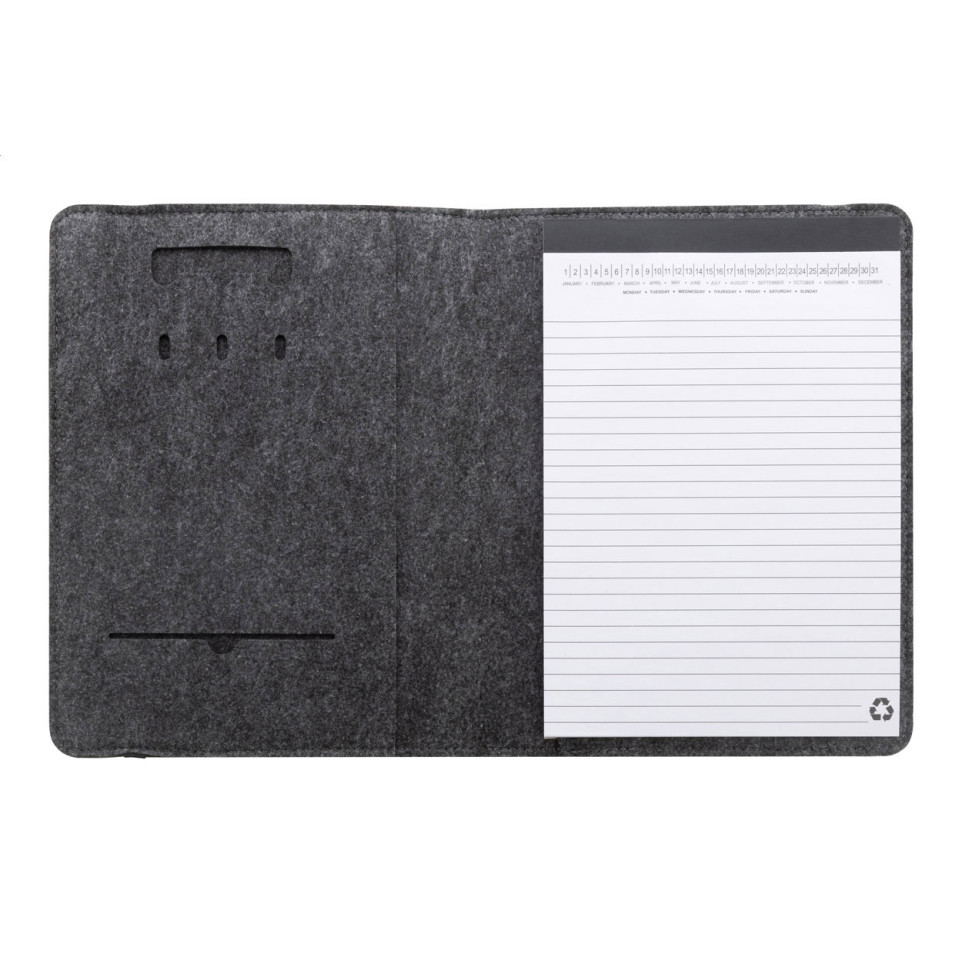 Compacte A5-documentenmap van donkergrijs RPET-vilt met ruim voorvak en diverse organiserende binnenvakken. Ideaal voor gestructureerd bewaren en meenemen van notities, documenten en accessoires op kantoor, onderweg of tijdens vergaderingen.