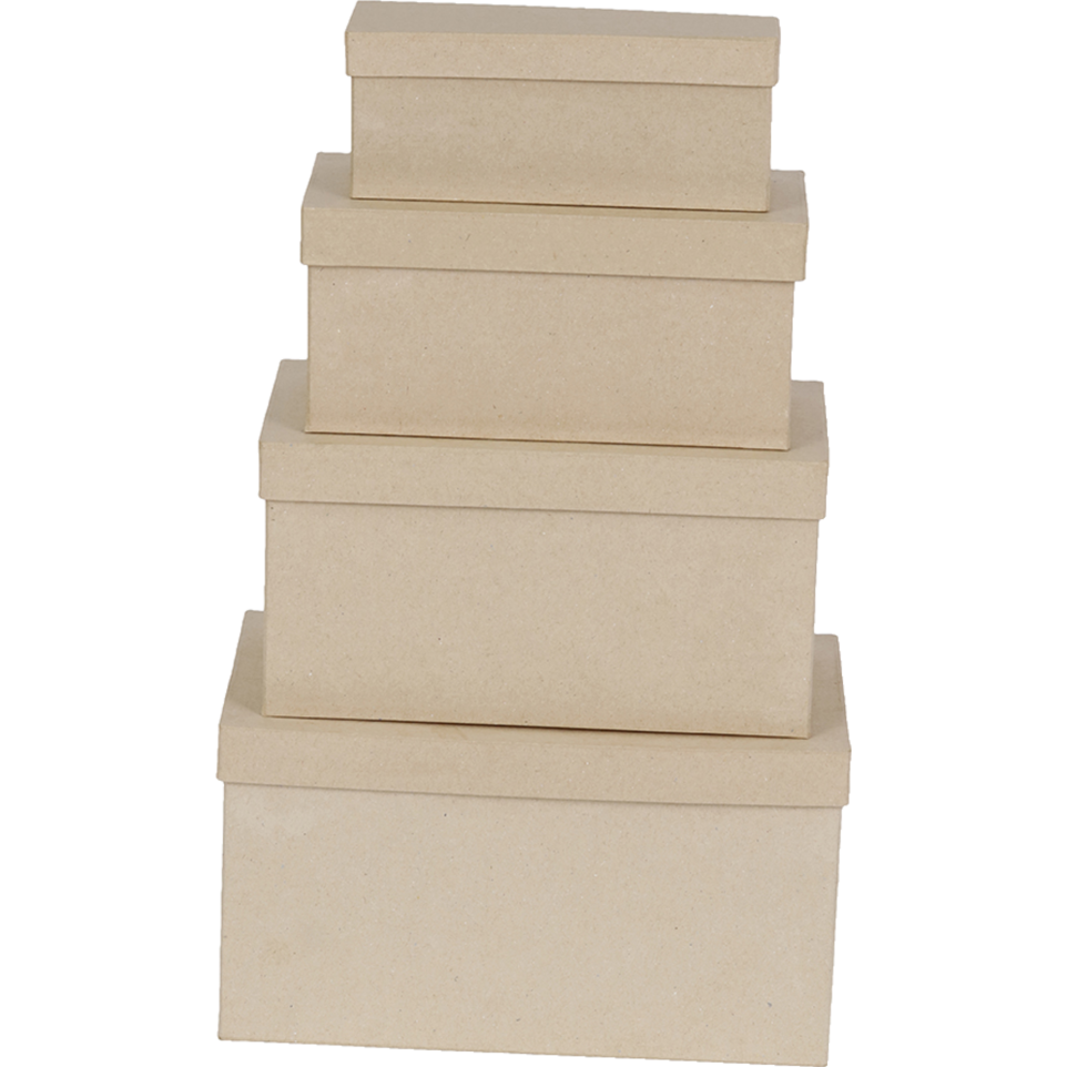 Set van 4 dozen Rechthoekig. De Décopatch dozen zijn gemaakt van maché papier en zijn beschikbaar in veel maten en vormen. 8x19x7cm/ 11x22x10cm/ 14x25x13cm/ 17x28x15cm