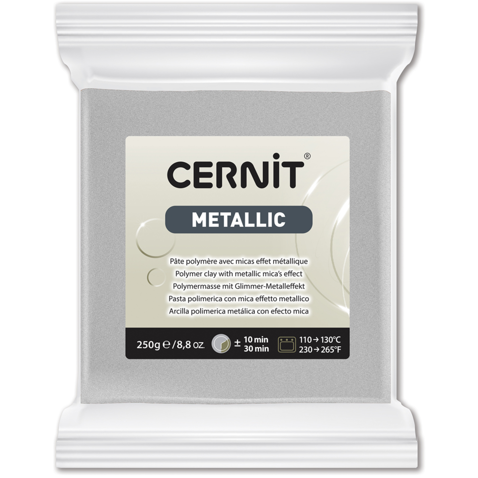 Cernit METALLIC 250g Zilver METALLIC : Bakklei (polymeer). Voor het verkrijgen van een hoogwaardig metaaleffect na het bakken. Bevat een grote hoeveelheid zeer fijne glitters (Mika genaamd). BAKINSTRUCTIES : Bak de klei op een temperatuur tussen 110°C (230°F) en 130°C (266°F) in een traditionele oven gedurende maximum 30 minuten. Zorgt voor geen geurhinder. Gaat niet barsten. Niet geschikt voor microgolfoven. Na het bakken, is de klei hard maar je kan ze nog altijd bewerken (schuren, schilderen, enz...) EIGENSCHAPPEN : Droogt niet uit. Na het bakken krijgt de klei vaste vorm, maar blijft ze soepel. De klei is geurloos, aangenaam om mee te werken, en blijft onbeperkt kneedbaar. Ze laat geen sporen na op je handen of gereedschap. Alle kleuren kunnen onderling worden gemengd om zo de gewenste tint te verkrijgen. Vegan. TOEPASSINGEN : Ideaal voor het maken van sieraden, reproducties, miniaturen, figuren enz. Zorg voor propere handen en een proper werkblad als je de klei bewerkt. Kneed de klei om ze zachter te maken vooraleer je ze bewerkt. Je kan ze boetseren, gieten, bedrukken of ze gebruiken in combinatie met andere materialen zoals stenen, parels, veren, enz. Je kan additieven zoals glitters, alcoholinkt enz. binnenin de klei toevoegen alvorens ze te bakken. GEWICHT : 250g. PRODUCTIE : Alle Cernit bakkleien worden gemaakt in België, in de buurt van Luik.