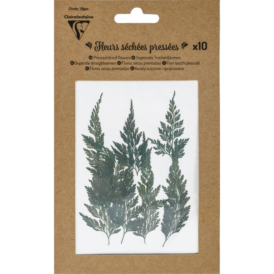 FLEURS SÉCHÉES PRÉSSÉES, Pochette de 10 pièces - Fougères Les fleurs séchées sont toujours très tendance. En bouquet ou intégrées dans des créations DIY, elles sont très appréciées des pasionnés de déco et de loisirs créatifs. Des usages multiples et des customisations variées pour les fans de DIY nature ! Il s'agit de véritables fleurs séchées préssées, elles sont à manipuler avec précaution à l'aide d'une pince. Pochette de 10 pièces.