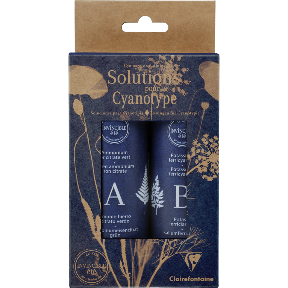 Solutions photosensibles, Boîte de 2 flacons (10g de potassium ferricyanure + 25g d'ammonium fer citrate vert) + carnet de conseils et astuces À préparer en les mélangeant avec de l'eau, les solutions photosensibles permettent aux amateurs et aux artistes de produire des images uniques en utilisant le soleil comme révélateur. Cette boîte contient 10g d'ammonium fer citrate vert, 25g de potassium ferricyanure et un carnet de conseils et d'astuces. Les produits de cette boîte permettent d'obtenir 200ml de produit de quoi réaliser 6 faces de t-shirts et 20 feuilles A4 OU 35 feuilles A3. Produit réalisé en collaboration avec Invincible Eté, créateur Français de cyanotype unique.