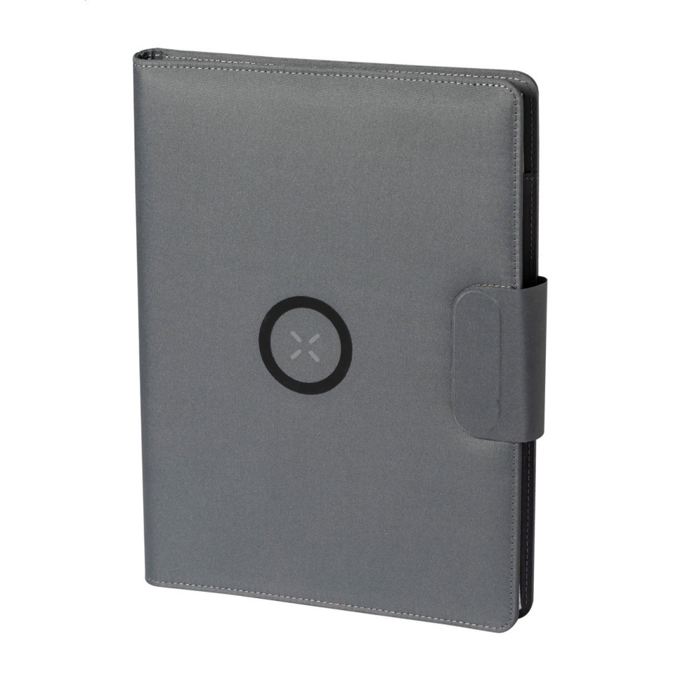 Gredox A4 grijze RPET documentmap met ingebouwde draadloze oplader, powerbank en mobiele houder. Perfect voor professionals die onderweg productief willen blijven met al hun essentiële technologie binnen handbereik.