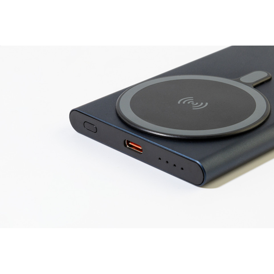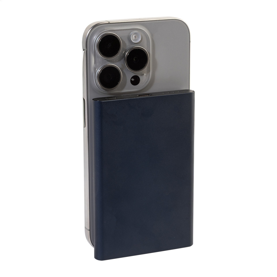 Compacte powerbank van gerecycled aluminium in donkerblauw, uitgerust met een ingebouwde magnetische draadloze snellader van 15 W en een batterijcapaciteit van 5000 mAh. Ideaal voor onderweg opladen.
