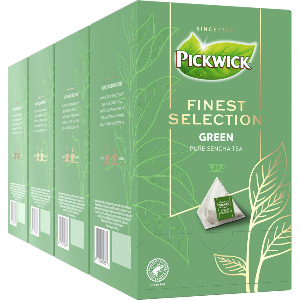 Pickwick Finest Selection Groene Thee is een verfijnde groene thee verpakt in piramidevormige zakjes die de smaak optimaal laten ontwikkelen. Dit pak bevat 25 individueel verpakte theezakjes, ideaal voor gebruik op kantoor, in de horeca of thuis.