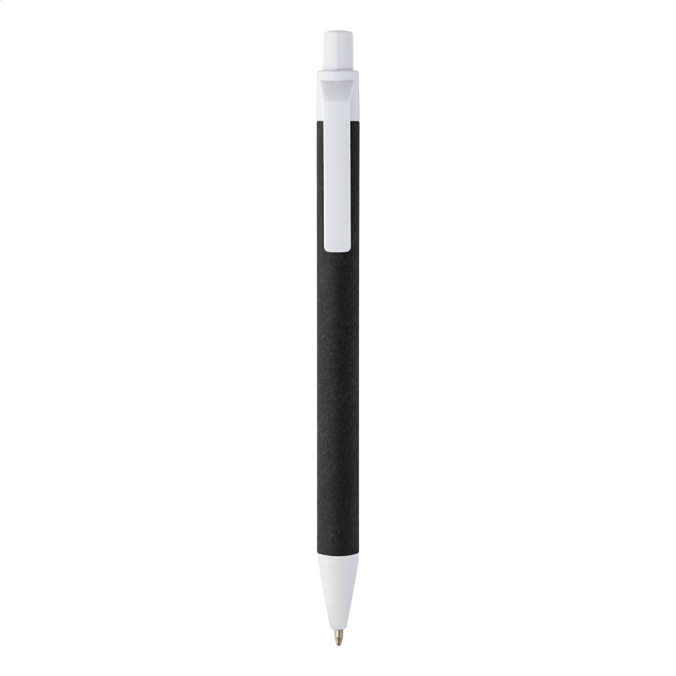 Gerecycleerde papieren balpen met witte behuizing en zwarte accenten, inclusief gerecyclede ABS-onderdelen. Schrijft in blauw en geschikt voor dagelijks noteren of professioneel gebruik.